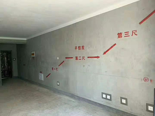 頂棚及墻角位置陰陽(yáng)角采用護(hù)角器處理,方正順直,美觀,后期起到防撞擊作用;墻面采用水泥砂漿抹面,地面五點(diǎn)標(biāo)識(shí)細(xì)致突出(H1-H5),便于驗(yàn)收測(cè)量房間方正及室內(nèi)凈高;并有實(shí)測(cè)實(shí)量墻體垂直度(垂直第二尺)、平整度(兩平一斜,第一尺、第二尺、第三尺),墻面踢腳線上口水平順直,建筑1米線顯著標(biāo)識(shí)便于業(yè)主后期二次裝飾使用。