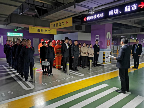 演練開(kāi)始,進(jìn)行現(xiàn)場(chǎng)滅火及被困人員解救實(shí)戰(zhàn)演練。當(dāng)有職工發(fā)現(xiàn)負(fù)一A區(qū)垃圾房發(fā)生火災(zāi)后,及時(shí)摁下消防手動(dòng)報(bào)警按鈕,并呼叫周邊同事前來(lái)?yè)渚瘸跗谄鸹饏^(qū)域。隨后客服人員對(duì)被困人員進(jìn)行現(xiàn)場(chǎng)救護(hù)及轉(zhuǎn)移、保衛(wèi)人員進(jìn)行火場(chǎng)區(qū)域隔離、消防戰(zhàn)斗人員進(jìn)行現(xiàn)場(chǎng)火情撲救。